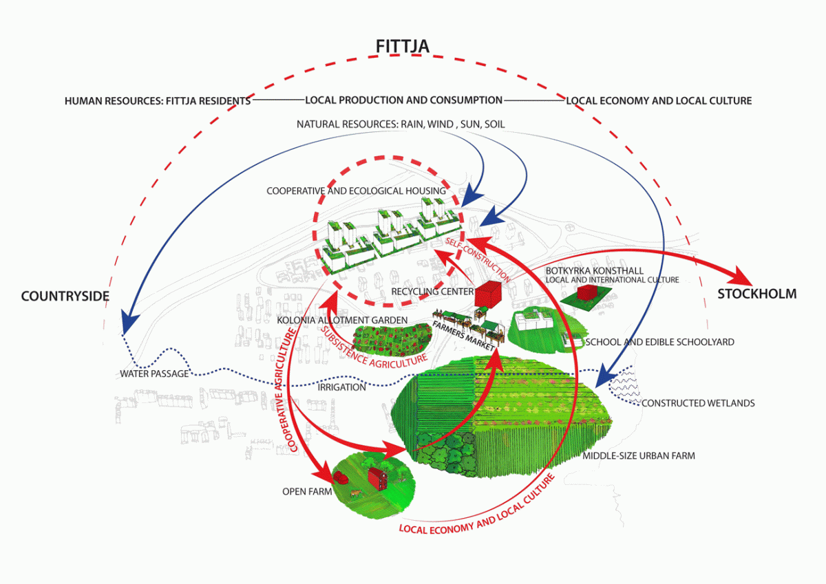 The main feature of the proposed vision is an Urban Farm, a symbolic project for a city in search of a new identity. The Urban Farm is a place where food is grown and goods and services are exchanged, but it is also a commercial enterprise, where the sale of vegetables benefits those who cultivate the land. The farm is a tool for changing the culture of living in Fittja. It is also a place where local residents learn self-management and engage in the rights of citizenship. They are empowered as citizens and aware of their own ability to create change. They understand and appreciate their own skills, resources, and creativity. They produce, exchange, and sell food, and also recycle waste. They understand the importance of the local loop of consumption and production.