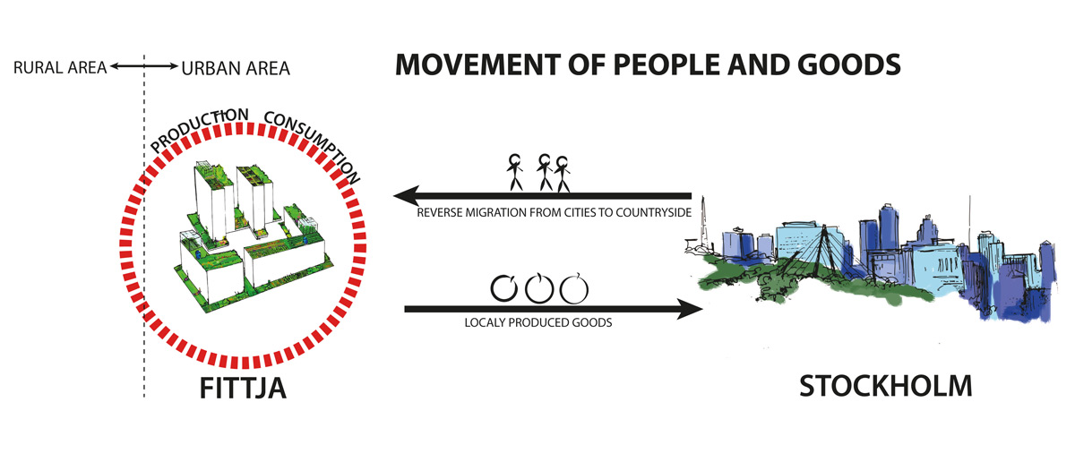Our proposal puts Fittja’s local human and natural resources to use and creates spaces for growing food (the urban farm) and production (the recycling centre). In short, this new vision for Fittja adds a vibrant local economy to the current suburban reality, transforming the satellite city into a thriving city with its own economy, which becomes more self-sufficient and therefore more resilient as it gradually closes the local loop of consumption and production. A movement of people and goods is generated from and to Fittja: for instance, local ecological produce is traded to Stockholm, and reverse migration brings in new settlers from Stockholm. While being a local story, Fittja’s reinvention also inspires other cities to follow its example in the search for a new and sustainable culture of living.